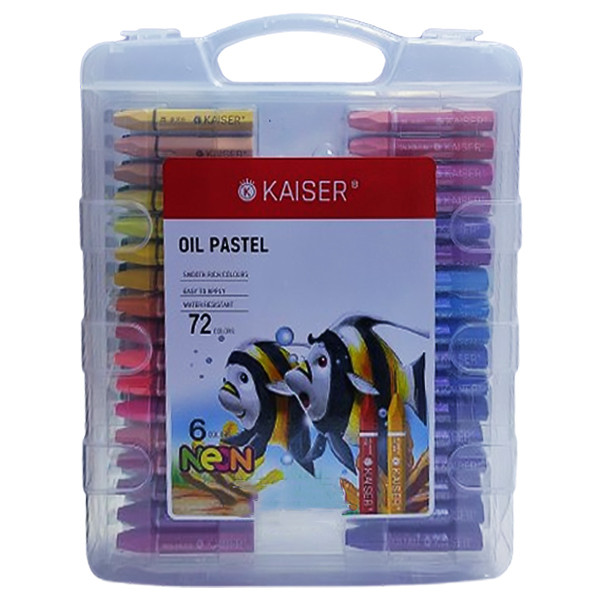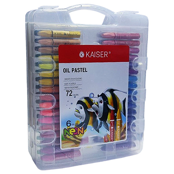 پاستل روغنی کایزر 72 رنگ با جعبه طلقی محکم ساخته شده از مواد مرغوب و غیر سمی و همچنین مقام در برابر آب می باشد .