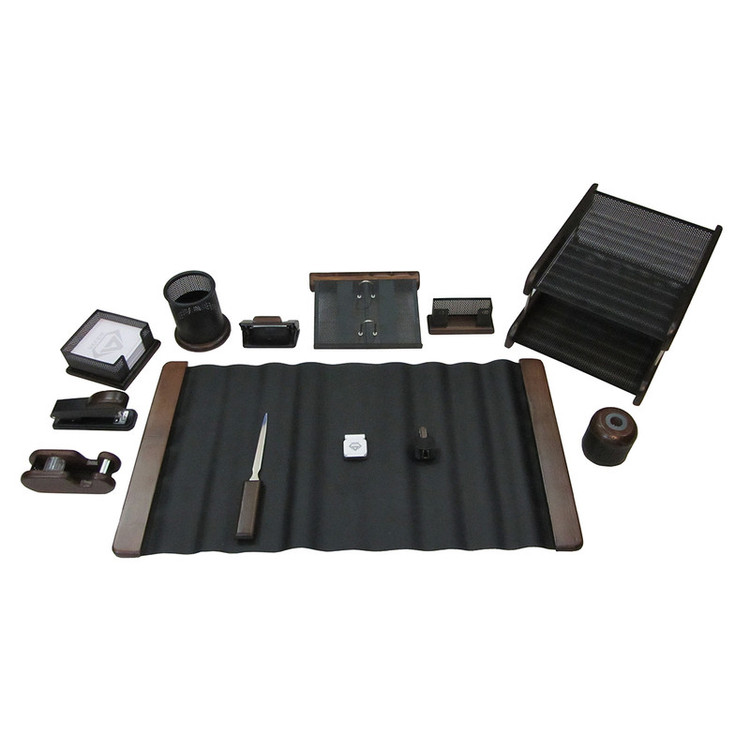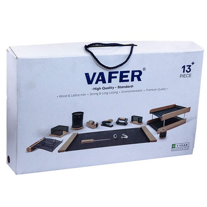 اقلام موجود در ست: کازیه , جاقلمی (استند خودکار) , جای کاغذ یادداشت , پایه چسب , پانچ , منگنه , منگنه کش , استند تقویم