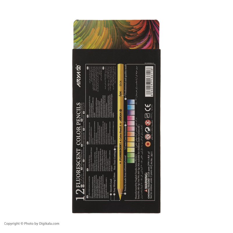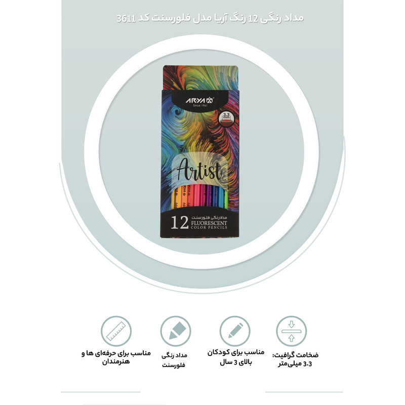 - مداد رنگی فلورسنت - ضخامت گرافیت: 3.3 میلیمتر - سری حرفهای آریا - مناسب برای حرفهای ها و هنرمندان - مغز مداد دارای رنگدانههای خالص و مرغوبتر - دارای قابلیت ترکیب پذیری بیشتر - مناسب برای کودکان بالای 3 سال