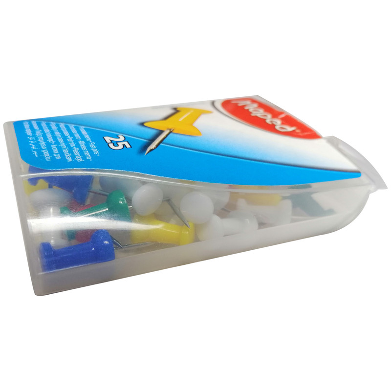 پونز رنگی مپد ساخت شرکت maped فرانسه دارای 25 عدد پونز رنگی سوزن تیز فلزی با دسته پلاستیکی قابل استفاده در یونولیت، چوب پنبه، کاغذ، مقوا ، اسفنج و ...