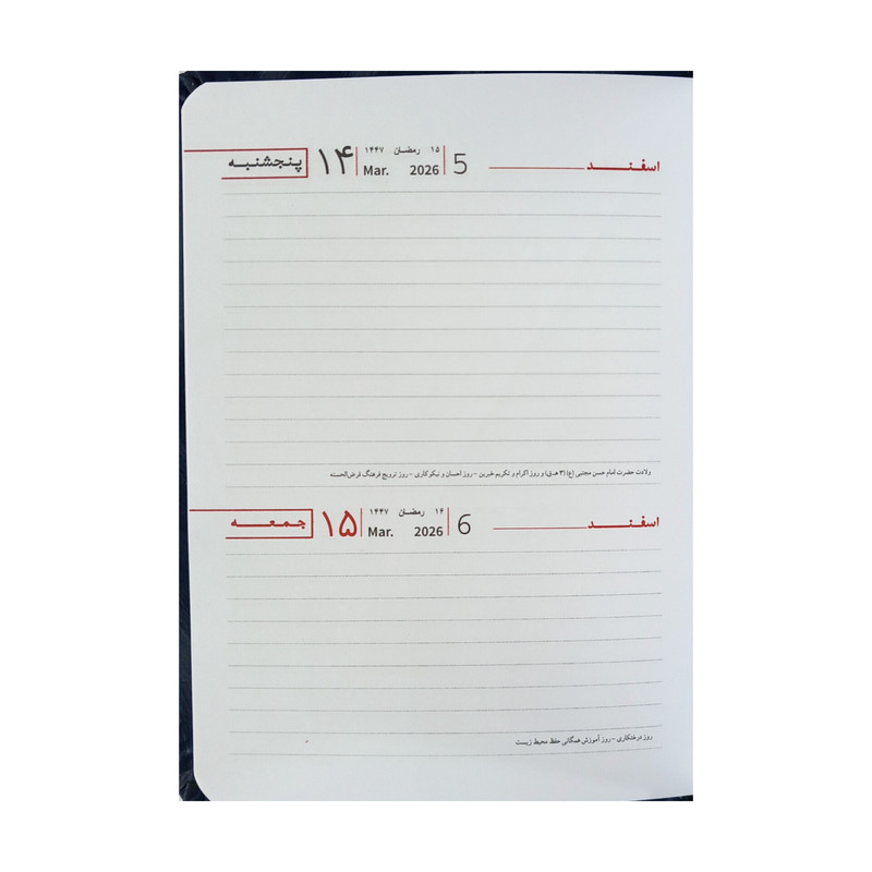 نوع صحافیته دوختسال1404نوع تقویمشمسینوع کاغذتحریرنواخت روزهاروز شمارقطعجیبیجنس جلدچرم مصنوعیفرم صحافیعمودیرنگسرمه ای