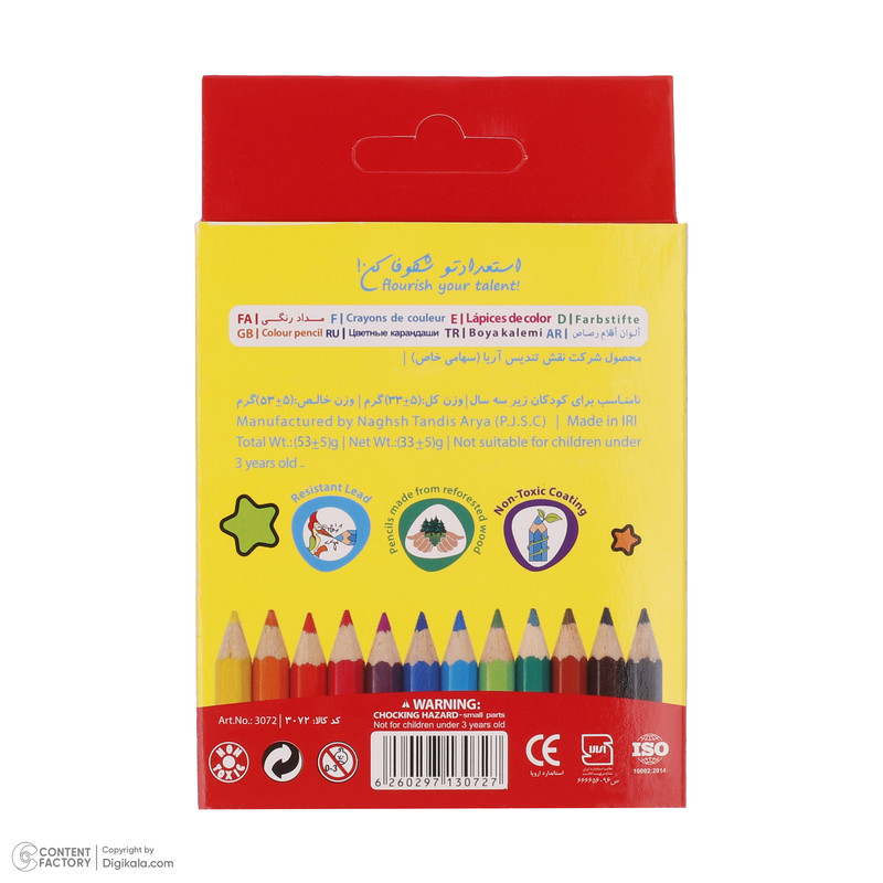طول بدنه135 میلیمتروزن33 گرمفرم سطح مقطعشش ضلعیقطر سطح مقطع10 میلیمترتعداد رنگهای موجود در بسته12 عددتعداد موجود در بسته12 عدددرجه سختی نوکHBجنس جعبهمقواییابعاد8.5×0.5×0.5 سانتیمتر