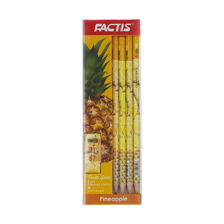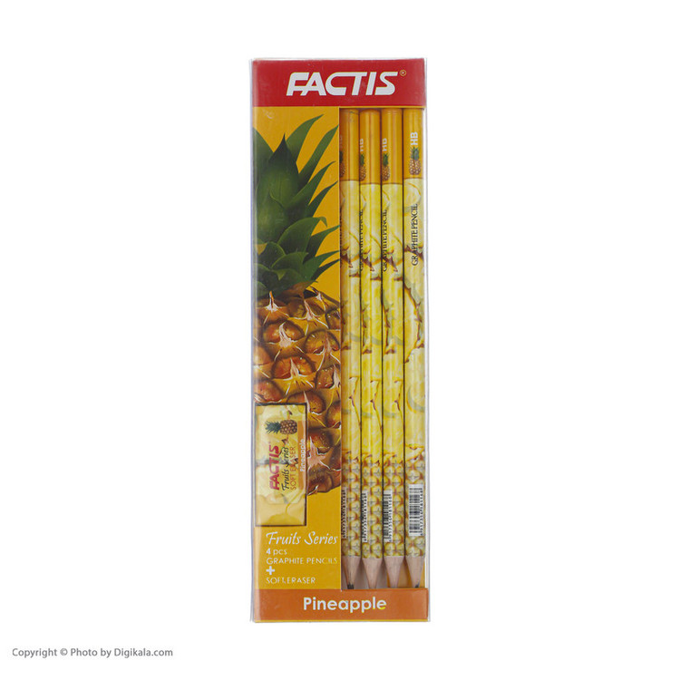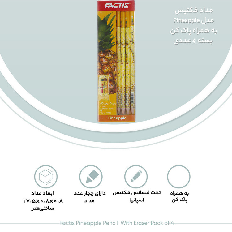 - تحت لیسانس فکتیس اسپانیا - دارای نوک با مغز روان - دارای 4 عدد مداد با روکش زیبا طرح میوه - دارای پاک کن - ابعاد پاک کن: 4×1.5×2 سانتیمتر با وزن: 10 گرم