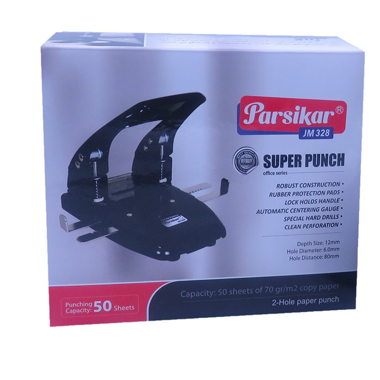 قابلیت پانچ ۴۵ برگ به صورت همزمان فاصله بین دو سوراخ پانچ : ۸۰ میلی متر ابعاد محصول: ۱۹۰x۱۶۰x۷۵ دارای پایه ضد لغزندگی قطر سوراخ های پانچ ۶ میلی متر وجود قفل دسته وجود ۲ خط کش از جنس فلز قابل تنظیم به صورت خودکار برای پانچ