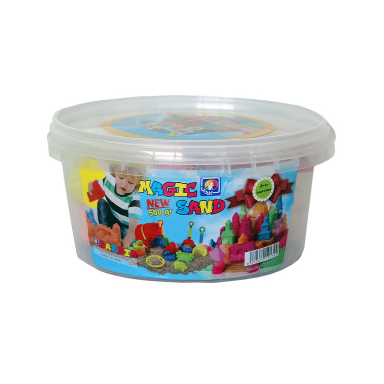 -دو بسته شن رنگی در دو رنگ به وزن مجموع 500 گرم -5 عدد قالب پلاستیکی به اشکال و رنگ ها گوناگون جهت قالب گیری شن