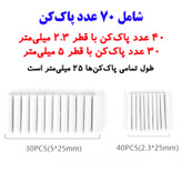 سایر توضیحات : شامل 70 عدد پاککن با طول 25 میلیمتر (40 عدد با قطر 2.3 میلیمتر و 30 عدد با قطر 5 میلیمتر) - مناسب برای تمامی مدلهای پاککن برقی از تمامی برندها (در صورتی که سایز پاک دستگاه شما با سایز محصول یکسان باشد)