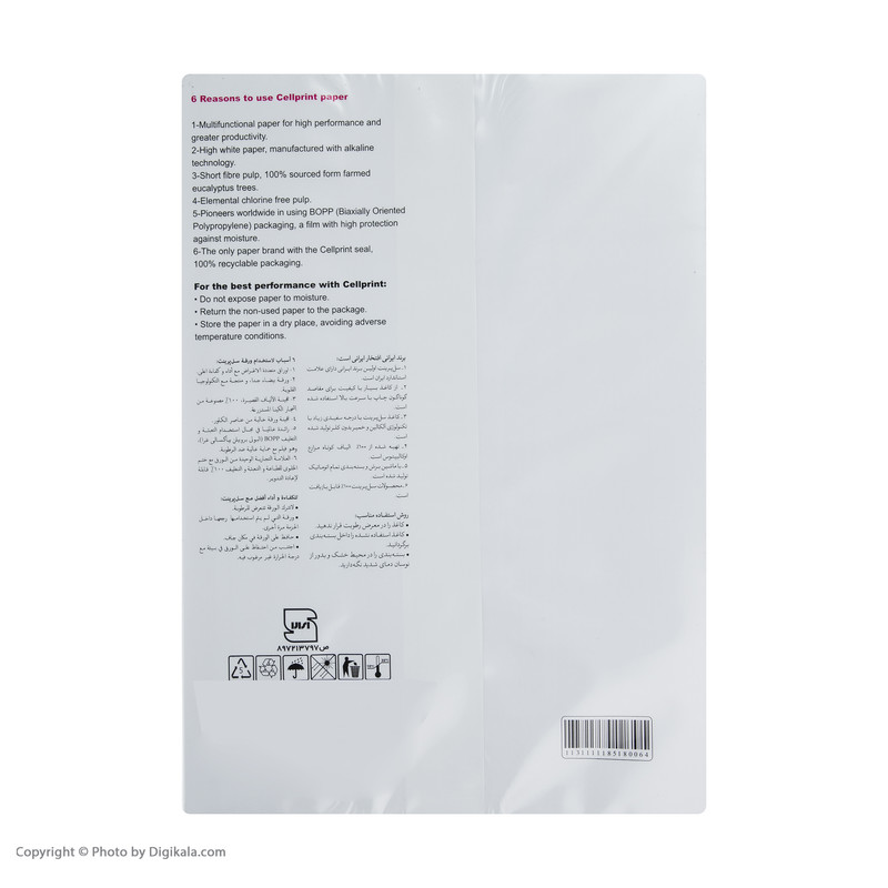 کاغذ A4 سل پرینت بسته 500 عددی دارای مشخصات فنی مناسبی است که آن را برای چاپهای مختلف مناسب میکند. این کاغذ دارای وزن 80 گرم، سفیدی 96 درصد، ضخامت 105 میکرومتر و سطح صاف و یکنواخت است. این کاغذ قابلیت جذب جوهر را به خوبی دارد و باعث میشود که چاپهای شما روشن، واضح و با رنگهای زیبا باشند. این کاغذ همچنین دارای مقاومت بالایی در برابر پارگی، چروکیدگی و رطوبت است و باعث میشود که چاپهای شما دوام بسیار بالایی داشته باشند.