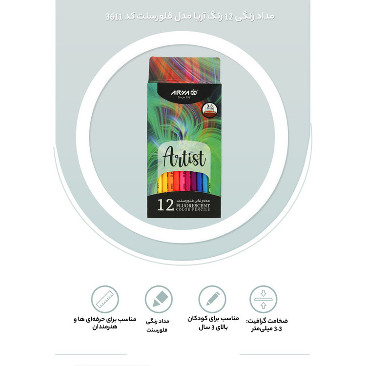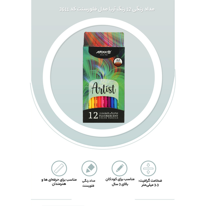 بدنه ساخته شده از جنس چوب باکیفیت و رنگ بهداشتی، قابلیت تراشیدن آسان و طول مداد 170 میلی متر ساخت ایران و دارای استاندارد CE، شامل 12 عدد مداد رنگی در بسته بندی مقوایی دارای نوک نرم و روان به ضخامت 3٫3 میلی متر و مقاوم در برابر شکستگی