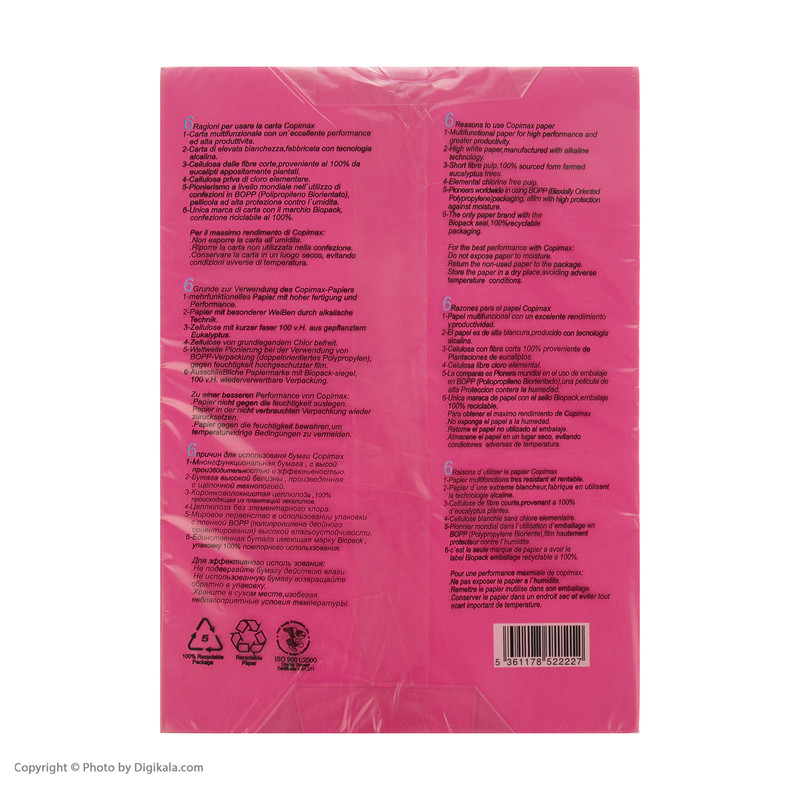 وزن5 گرمسایر توضیحات- کاغذ خارجی - سازگار با محیط زیست - لیزر - فکس - کپی - دارای گوهینامه ایزو 9001 - وزن بسته بندی: حدود 2400 گرمابعاد300x210 میلیمتر