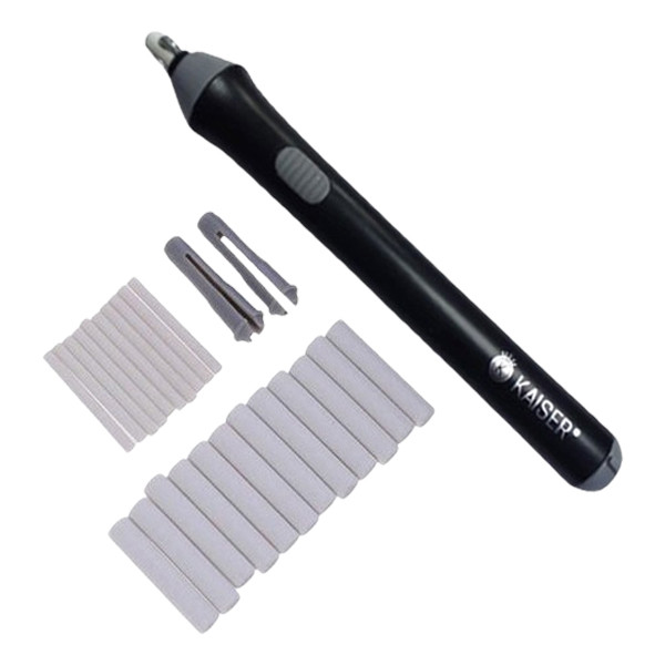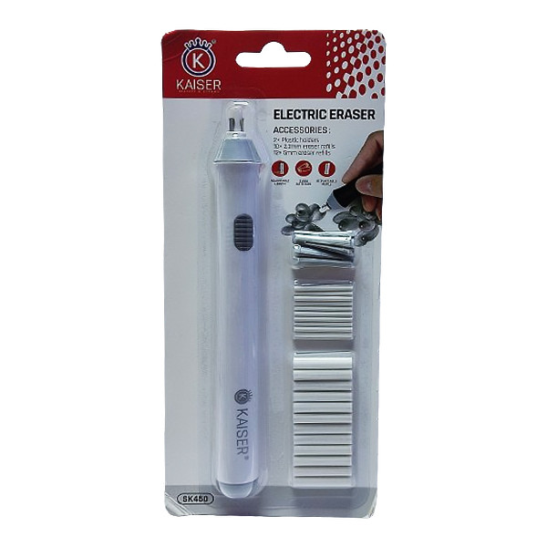 پاک کن برقی حرفه ای کایزر کد SK450 وسیله ای پرکار برد برای طراحان سیاه قلم و مداد رنگی دارای 10 عدد پاک کن ظریف سایز 2.3 و همچنین 12 عدد یدک پاک کن سایز نرمال و با دو سر مختلف و دارای موتور قوی است با طراحی خاص ارگونومیک و خوش دست بودن برای راحتی شما تولید شده است